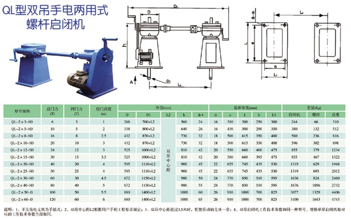 1.雙吊點(diǎn)螺桿式啟閉機(jī)廣泛用于:水利水電、水庫(kù)、河道、養(yǎng)殖排灌等各種水利工程。本系列啟閉機(jī)按吊點(diǎn)數(shù)分為單吊點(diǎn)和雙吊點(diǎn)兩種型號(hào),按驅(qū)動(dòng)方式分為手動(dòng)、電動(dòng)和手電兩用三種形式,一般啟閉容量超過600KN(單機(jī))時(shí)不再配置手動(dòng)機(jī)構(gòu)。我公司生產(chǎn)的QL型系列雙吊點(diǎn)螺桿啟閉機(jī)啟門力為3KN-650KN,超過650KN(單機(jī))時(shí)可特殊設(shè)計(jì)。
